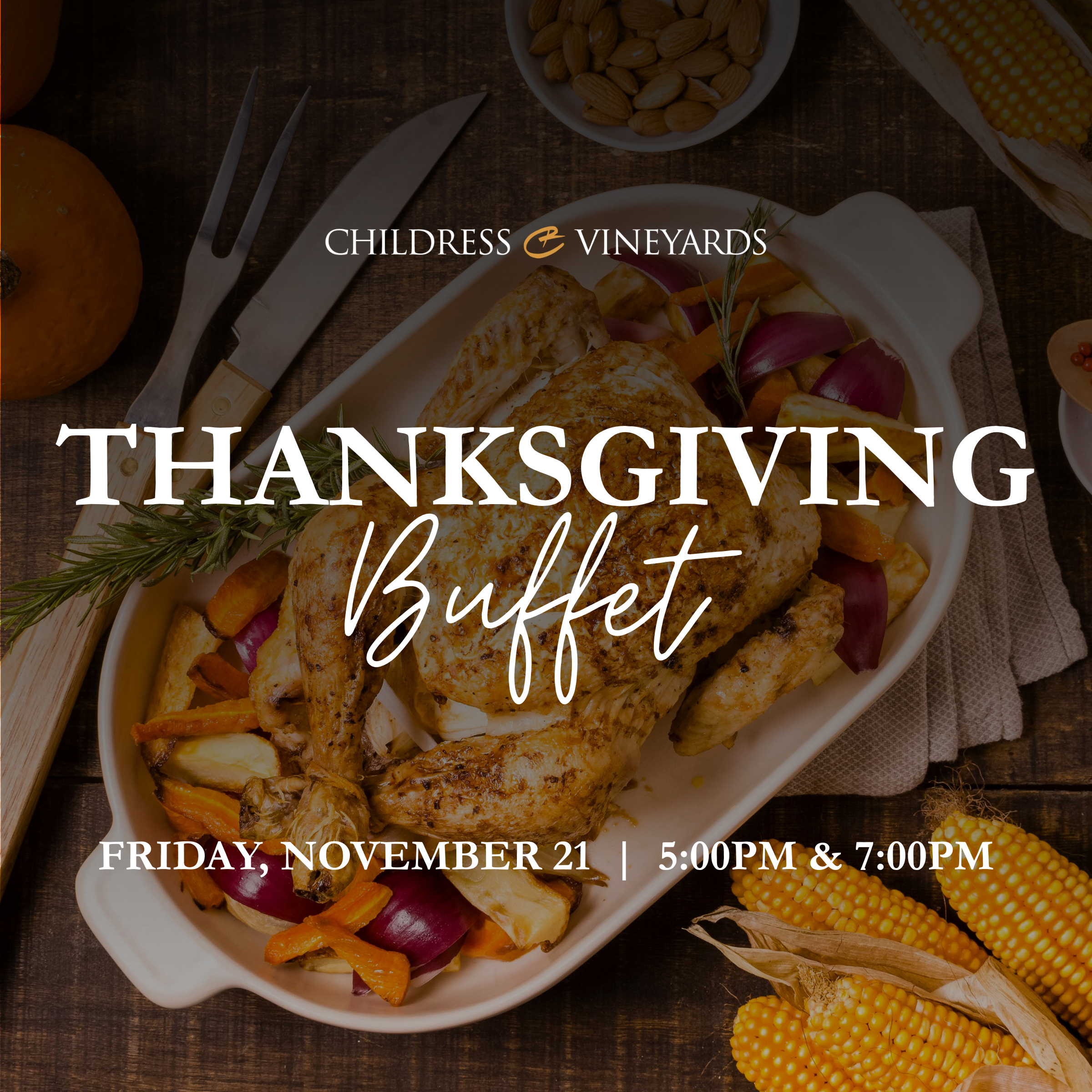 Guests will enjoy a beautifully prepared buffet featuring traditional Thanksgiving favorites and seasonal vineyard-inspired dishes, all in the warm and elegant atmosphere of Childress Vineyards.